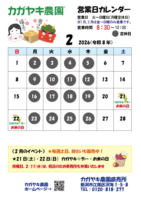 2026.01.31直売所カレンダー 2026年2月 営業日カレンダー 1月、2月の直売所は、金~日曜日のみ営業しています。 ★焼きいも、ポップコーンは毎週土日に販売しています。 2/21(土)、22(日)は「カガヤキ☆デー」「お米の日」です。 コシヒカリ、こしいぶきをお買い得価格で販売する予定です。 ※月曜日と2/11(水)は祝日のため事務所も休業いたします。 皆さまのご来店をお待ちしております!