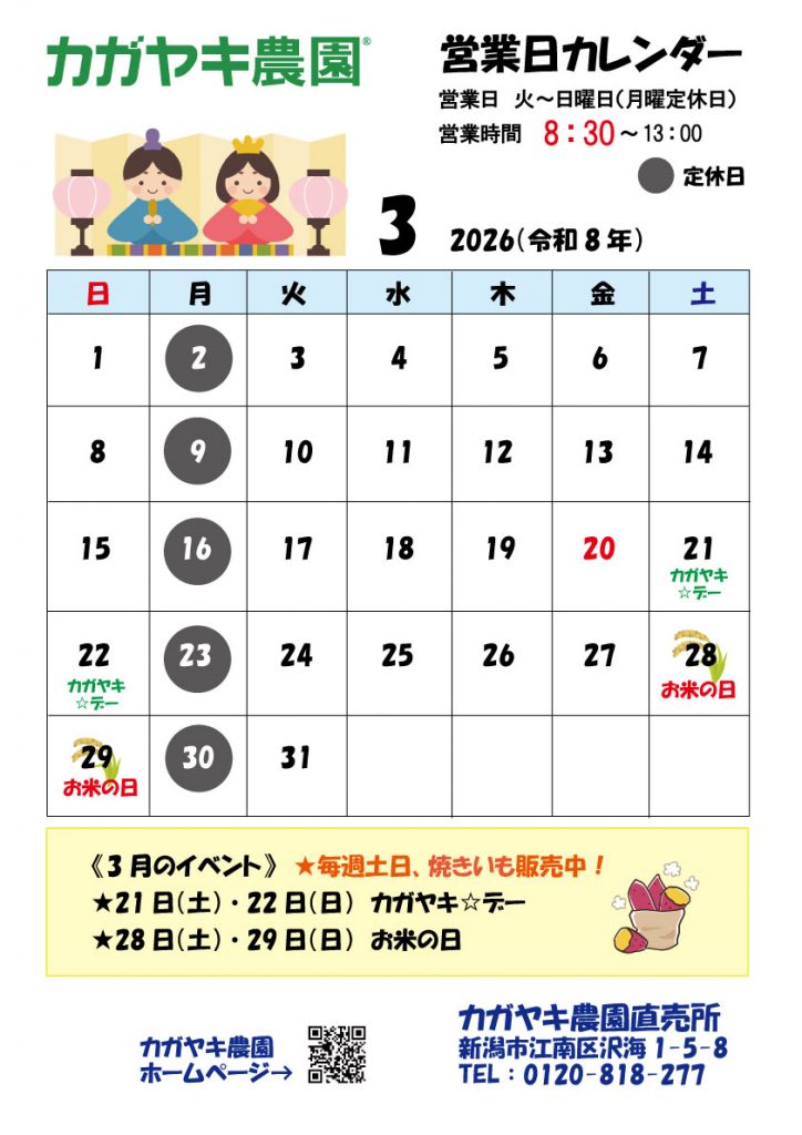 2026.02.28直売所カレンダー 2026年3月 営業日カレンダー 3月から直売所は、通常営業(月曜日定休)になります。 ★焼きいも、ポップコーンは毎週土日に販売しています。 3/21(土)、22(日)は「カガヤキ☆デー」です。 3/28(土)、29(日)は「お米の日」です。 コシヒカリ、こしいぶきをお買い得価格で販売する予定です。 皆さまのご来店をお待ちしております!