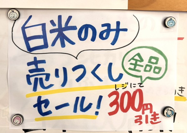 12/30限定!白米全品、「売りつくしセール」を行います。通常価格からレジにて300円お値引きいたします。