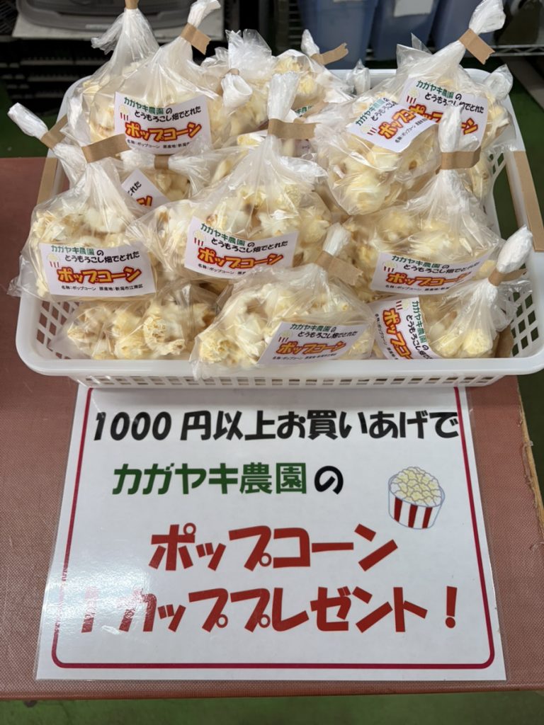1,000円以上お買い上げで、カガヤキ農園のポップコーンをプレゼントしています。