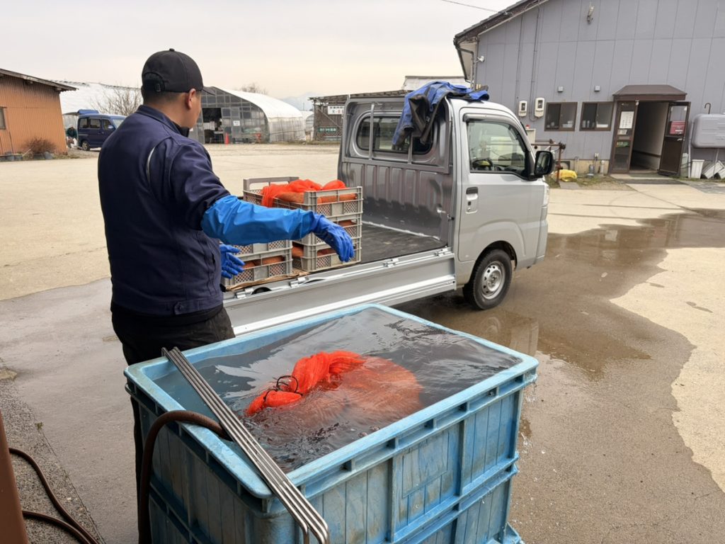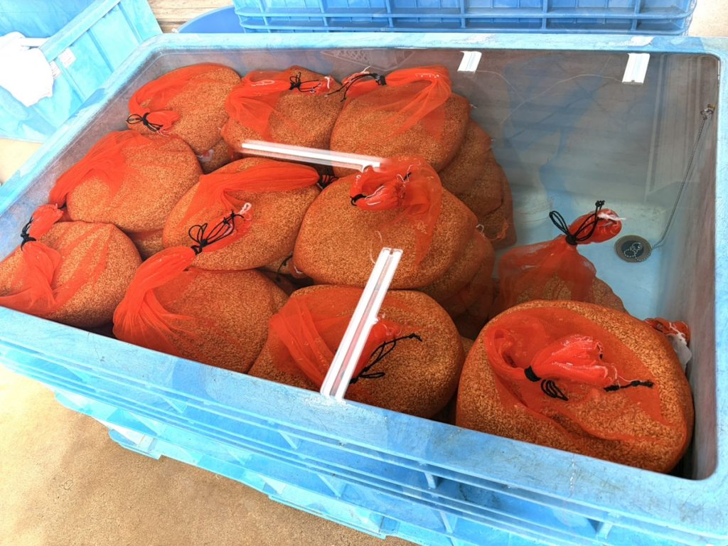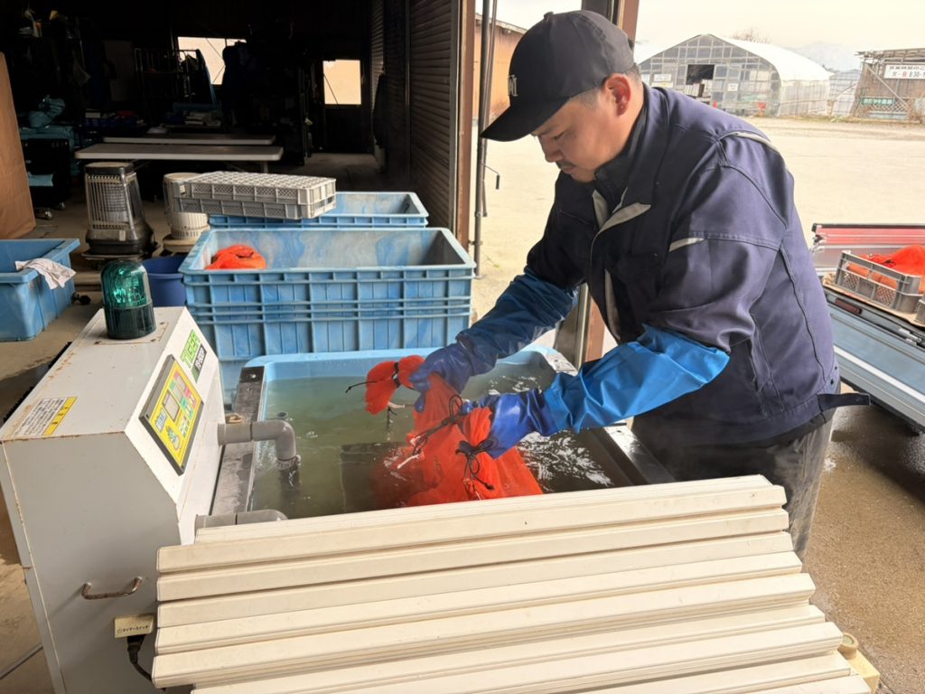 2026.03.18新潟米 今年も稲の種まきの準備が始まりました! 今年も稲の種まき準備が始まりました。種もみの病気が出ないように温湯消毒を行います。 全体にお湯が行き渡るようにしっかりと沈めます。 10分後、すぐ冷水に移します。 種もみは、10日から2週間ほど水に浸します。 その後、芽出し機に1~2日間入れて、発芽させたら種まきを行います。