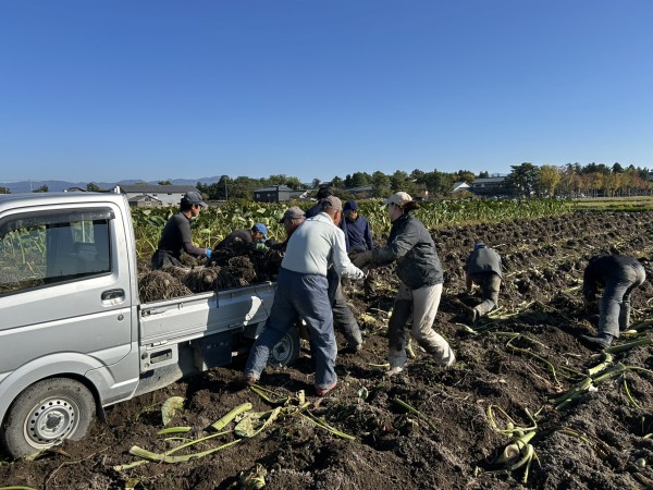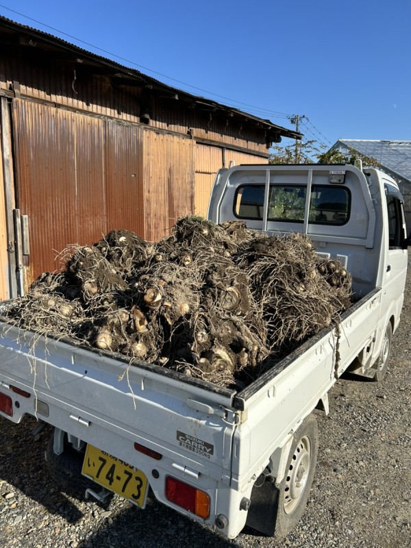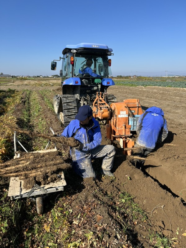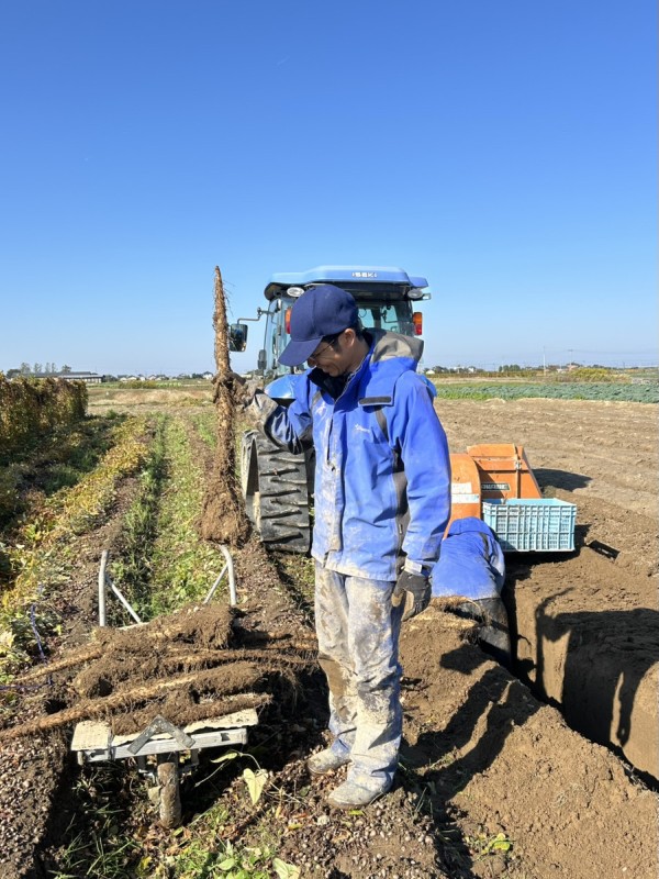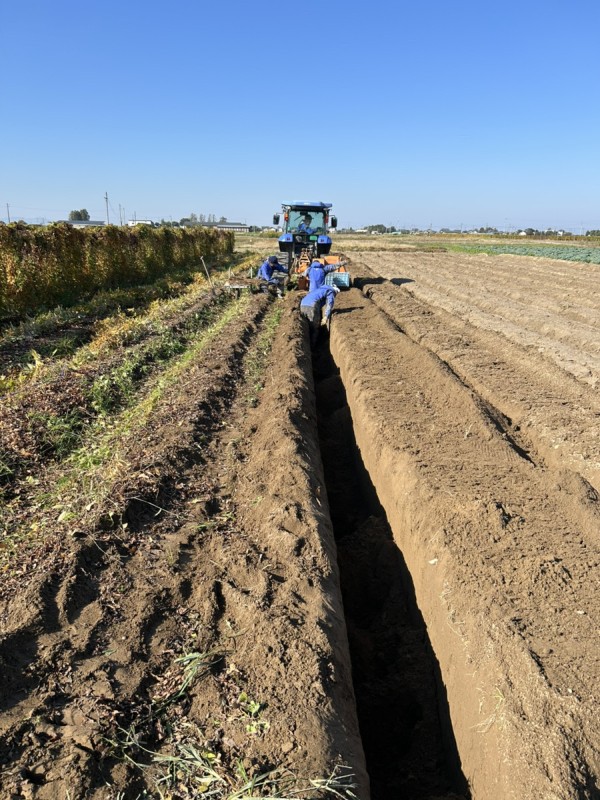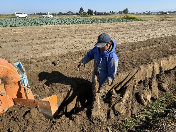 トラクターのトレンチャーで土を腰の高さくらいまで深く掘り、長いもを折らないように気を付けて抜きます。