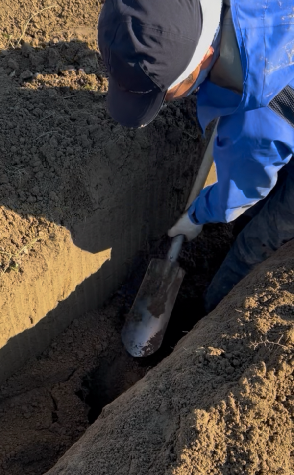 土の畑なので、なかなか長いもが抜けにくいことがあります。抜けないときは、スコップで手で掘りながら抜きます。
