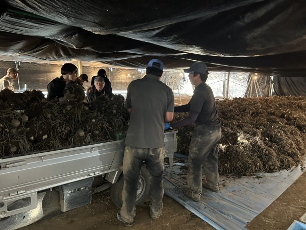 トラック4~5台分に積み終わったら、一気にハウスへ運びます。