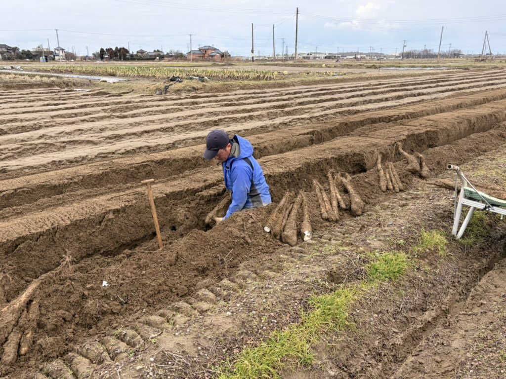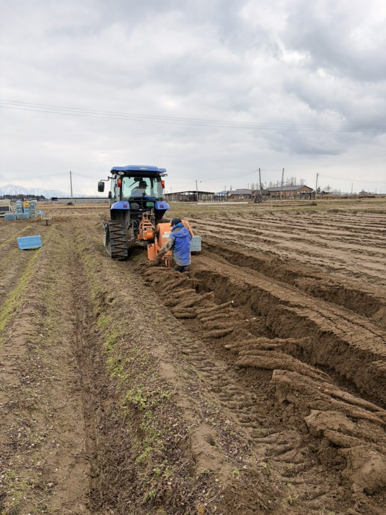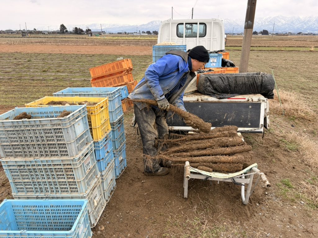 2026.02.17長芋 長いもの春掘りが始まりました 新潟はまだまだ寒い日が続いていますが、今日から長いもの春掘りが始まりました。 トレンチャーで長いもの周りの土を掘り出し、手で1本ずつ抜き出します。 深くて抜けなかった長いもは、スコップで土を掘ります。 たくさん収穫できました。 収穫した長いもをトラックへ移動して、大きさごとに選別してコンテナへ入れます。